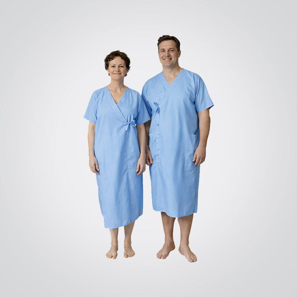 The patient gown is crafted from proprietary fade and wrinkle-resistant spun printed nontransparent fabric, ensuring a soft feel and high comfort. Its front-open design features a small tie inside and an overlap tie on the left side.